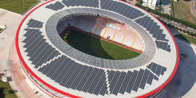 Antalya Stadyumu’nda, çatıdaki güneş panelleriyle yaklaşık 500 konutun günlük ihtiyacı kadar elektrik üretiliyor. Antalya Stadyumu’nun çatısındaki güneş panellerinden yıllık ortalama 1,4 milyon kilovatsaat (kWh) elektrik üretimi sağlandı.