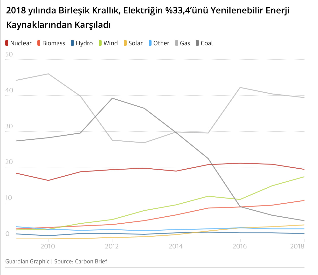 Enerji verimliliği ve değişen ekonomi ile birlikte 2018 yılında yüzde 33 yenilenebilir kaynaklardan sağlanan İngiltere’nin elektrik üretimi, yüzde 1 oranında azalarak 1994’ten bu yana en düşük seviye geriledi. Elektrik üretimi için yenilenebilir kaynakların ilk kez kömürden daha fazla kullanıldığı Birleşik Krallık’ta 2018 yılı, bugüne kadarki “en yeşil yıl” olarak ilan edildi.