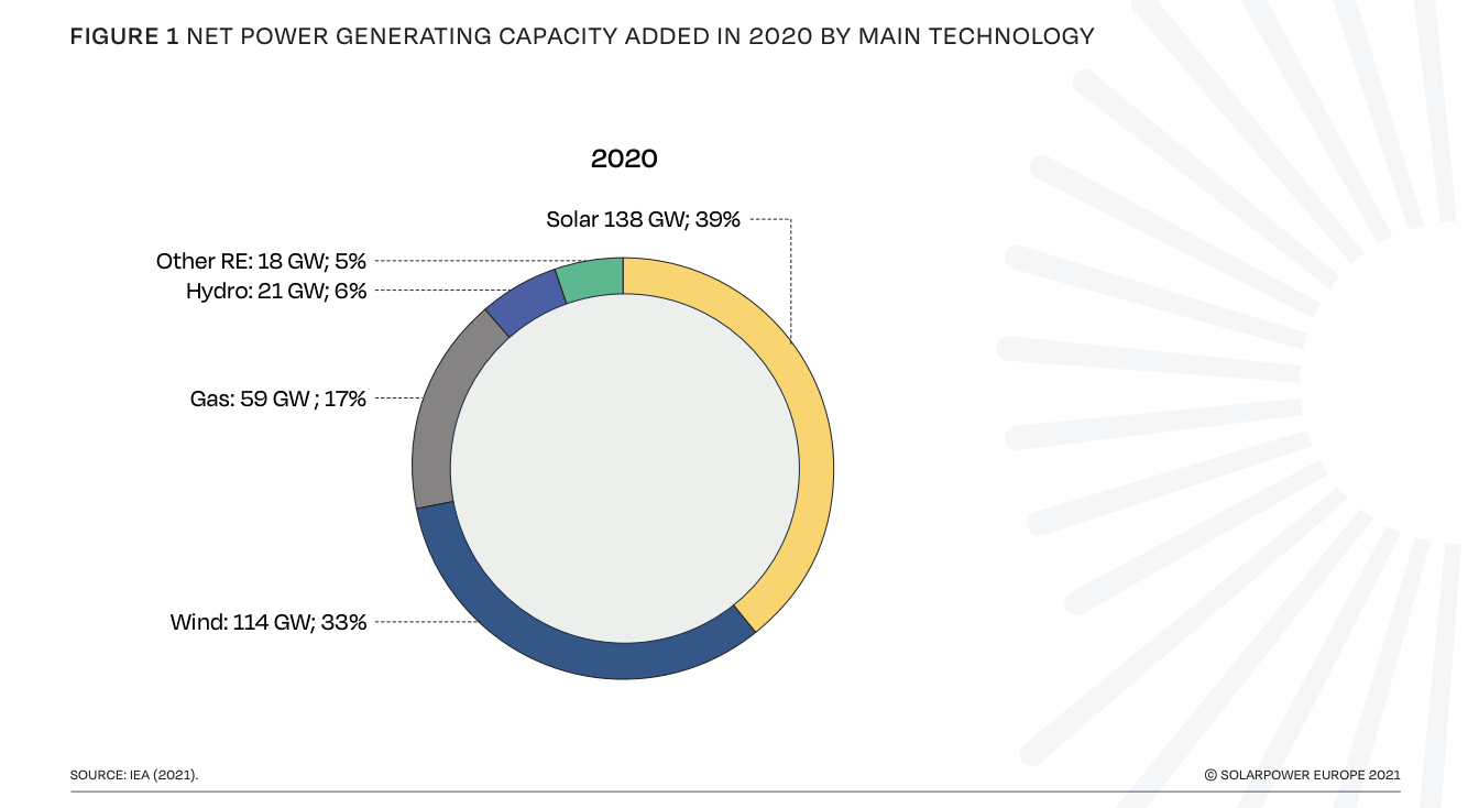 SolarPower Europe tarafından hazırlanan Global Market Outlook For Solar Power 2021-2025 (Güneş Enerjisi İçin Küresel Pazar Görünümü 2021-2025) raporuna göre, 2020’de kurulan her üç santralden biri güneş enerjisi santrali oldu. Geçtiğimiz yıl küresel çapta 138.2 GW kapasitelik güneş enerjisi kurulumu ile güneş teknolojilerinde yüzde 39’luk bir küresel paya ulaşıldı.