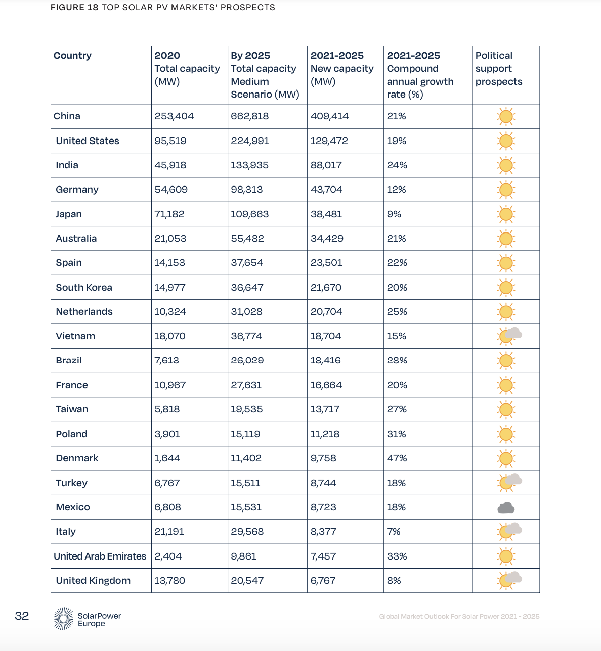 SolarPower Europe projeksiyonları, yüzde 39’luk küresel paya ulaşan güneş enerjisi teknolojileri ile 2020’de eklenen 138.2 GW’lik küresel fotovoltaik kapasitenin 2021’de 163 GW, 2022’de 203 GW, 2023’te 225 GW, 2024’te 239 GW ve 2025’te 266 GW olacağını öngörüyor. Raporun orta hırslı senaryosuna göre, toplam küresel güneş enerjisi kapasitesinin önümüzdeki beş yıl içinde şu kilometre taşlarını geçmesi bekleniyor: 2021’de 900 GW, 2022’de 1,1 TW, 2023’te 1,3 TW, 2024’te 1,6 TW ve 2025’te 1,8 TW. Rapor, optimal koşullar altında, 2025’in sonuna kadar 2,1 TW büyüklüğünde küresel güneş enerjisi kapasitesine ulaşılacağını belirtiyor.