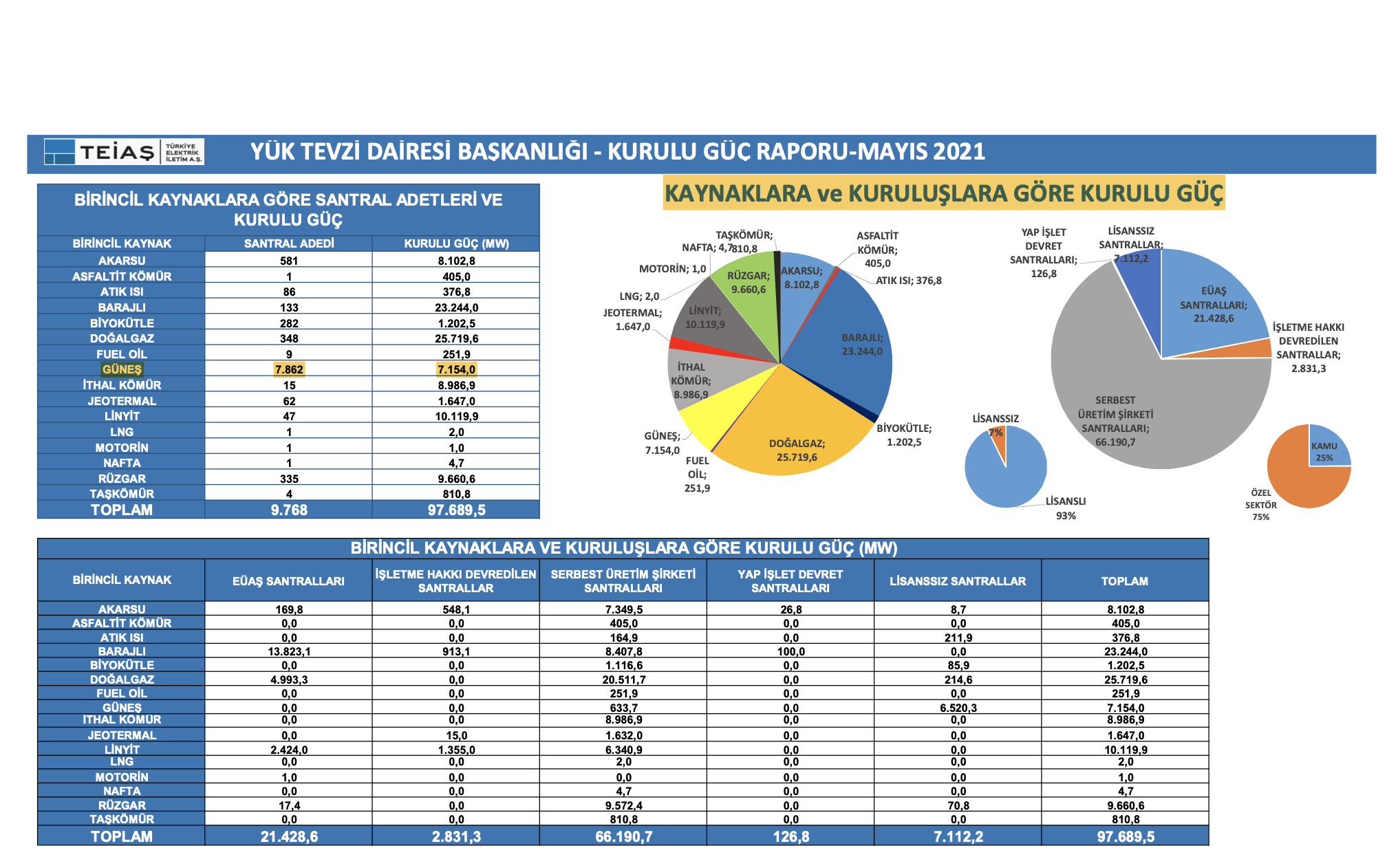 Türkiye Elektrik İletim A.Ş. (TEİAŞ) Mayıs 2021 Kurulu Güç Raporunu Yayınladı. Rapora göre, toplam kurulu güç 97.689,5 MW olurken 2021 Mayıs ayı sonunda kurulu gücün 7.154 MW’lık kısmı güneş enerjisi santrallerinden sağlandı. Güneş enerjisindeki kurulu güç bir önceki aya göre 89 MW artış gösterdi.