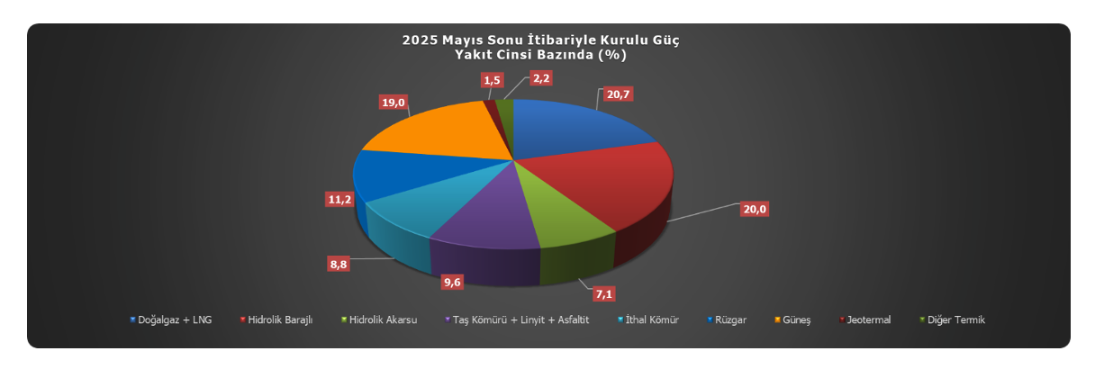 2025 yılı Mayıs ayı sonunda oluşan toplam kurulu gücün %20,7’lik kısmı (24.628 MW) doğal gaz ve LNG yakıt tipi santralleri ile karşılanırken, %20,0’lık kısmı (23.863 MW) barajlı hidrolik santraller tarafından karşılandı. Bu yakıt tiplerini %9,6’lık (11.478 MW) oran ile yerli kömür santralleri ve %8,8’lik oran (10.456 MW) ile ithal kömür santralleri izledi.