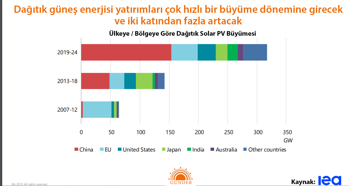 2024 yılında kurulu yenilenebilir enerji kapasitesindeki tahminlerde, 1.219 GW ile Çin ilk sırada gelirken 411 GW’lik yenilenebilir enerji kapasitesiyle ABD ikinci sırada yer alacak. Türkiye’nin 42 GW seviyesindeki mevcut yenilenebilir enerji kapasitesinin ise 2024 yılında yüzde 50 artış ile 63 GW’ye ulaşacağı öngörülüyor. Türkiye’nin 2018 sonu itibarıyla 5,1 GW seviyesindeki güneş enerjisi kurulu gücü ise 2024 yılında iki katına yükselerek 15,1 GW olacak. Güneş enerjisindeki ilave 10 GW kapasite artışının 3,7 GW’lik kısmı ise dağıtık enerji sistemlerinden sağlanacak.