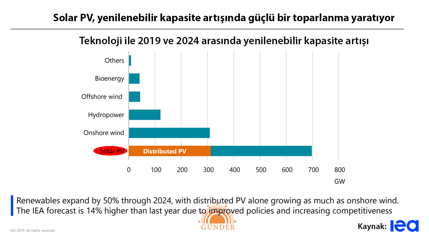 2024 yılında kurulu yenilenebilir enerji kapasitesindeki tahminlerde, 1.219 GW ile Çin ilk sırada gelirken 411 GW’lik yenilenebilir enerji kapasitesiyle ABD ikinci sırada yer alacak. Türkiye’nin 42 GW seviyesindeki mevcut yenilenebilir enerji kapasitesinin ise 2024 yılında yüzde 50 artış ile 63 GW’ye ulaşacağı öngörülüyor. Türkiye’nin 2018 sonu itibarıyla 5,1 GW seviyesindeki güneş enerjisi kurulu gücü ise 2024 yılında iki katına yükselerek 15,1 GW olacak. Güneş enerjisindeki ilave 10 GW kapasite artışının 3,7 GW’lik kısmı ise dağıtık enerji sistemlerinden sağlanacak.