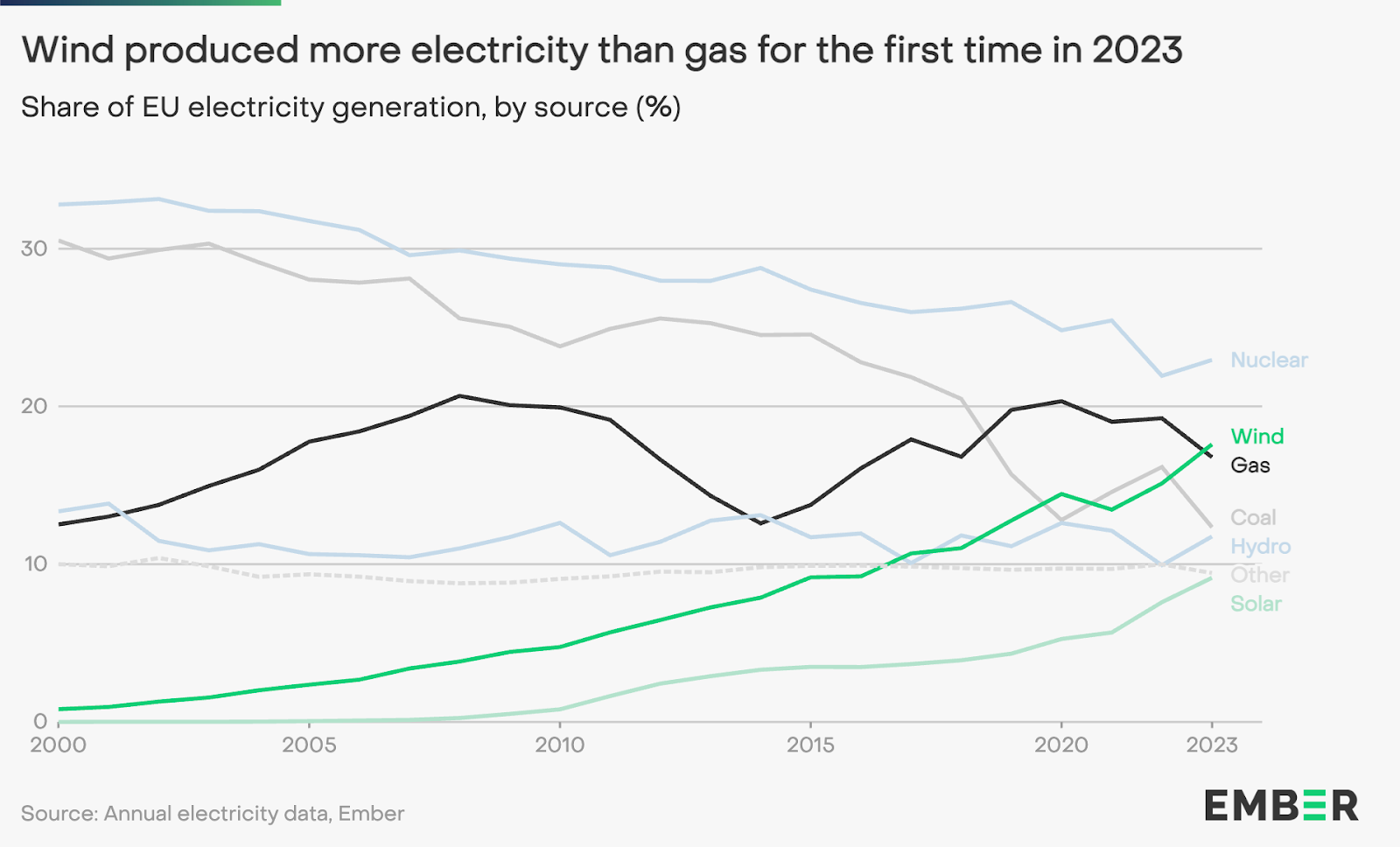 Ember incelemesine göre, fosil yakıtların üretimi 2023’te %19’luk rekor bir düşüşle ilk kez AB elektriğinin üçte birinden daha azını oluşturdu. Kömür %26’lık düşüşle 333 TWh ile şimdiye kadarki en düşük seviyesine geriledi veya AB elektrik üretiminin %12’sini oluşturdu. Kömürdeki düşüş gazda bir artışa neden olmamış, bunun yerine gaz %15 oranında düşerek en az 1990 yılından bu yana en büyük yıllık düşüşü yaşamış ve üst üste dördüncü kez gaz üretimi azalmıştır.