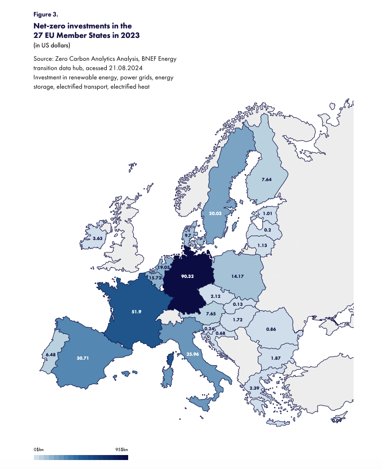 Avrupa içinde bazı ülkeler net sıfır yarışının fırsatlarını değerlendiriyor: Polonya, Avrupa’nın temiz teknoloji üretim merkezi haline gelirken, İspanya ve Danimarka rüzgar enerjisi alanında liderler arasında yer alarak binlerce kişiye iş imkanı yaratıyor. Ancak Almanya ve Fransa’nın net sıfır yatırımlarının %45’ini alması, iki vitesli bir Avrupa’ya ilişkin endişeleri artırıyor.