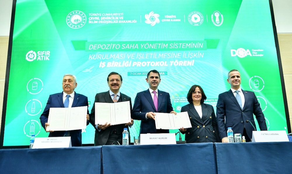 Depozito Saha Yönetim Sisteminin Kurulması ve İşletilmesine İlişkin İş Birliği Protokolü, Çevre, Şehircilik ve İklim Değişikliği Bakanı Murat Kurum’un da katıldığı törende, Türkiye Odalar ve Borsalar Birliği (TOBB) Başkanı M. Rifat Hisarcıklıoğlu, TESK Başkanı Bendevi Palandöken ve Türkiye Çevre Ajansı Başkanı Prof. Dr. Ferhat Pirinççi tarafından imzalandı.