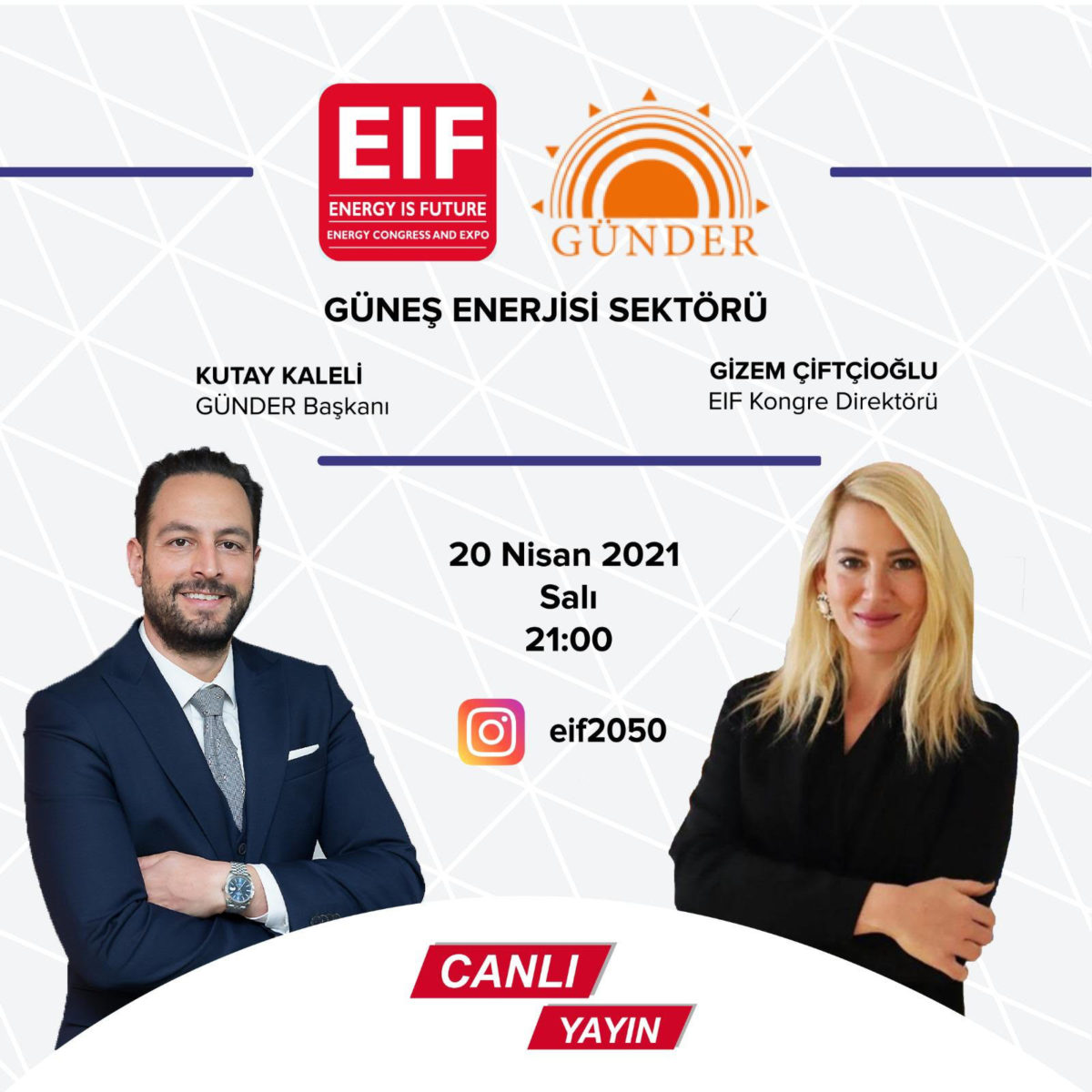 GÜNDER Başkanı Kutay Kaleli, güneş enerjisi sektörünün tüm detaylarını EIF Enerji Kongresi ve Fuarı’nın Instagram canlı yayınında EIF Kongre Direktörü Gizem Çiftçioğlu ile paylaşacak.