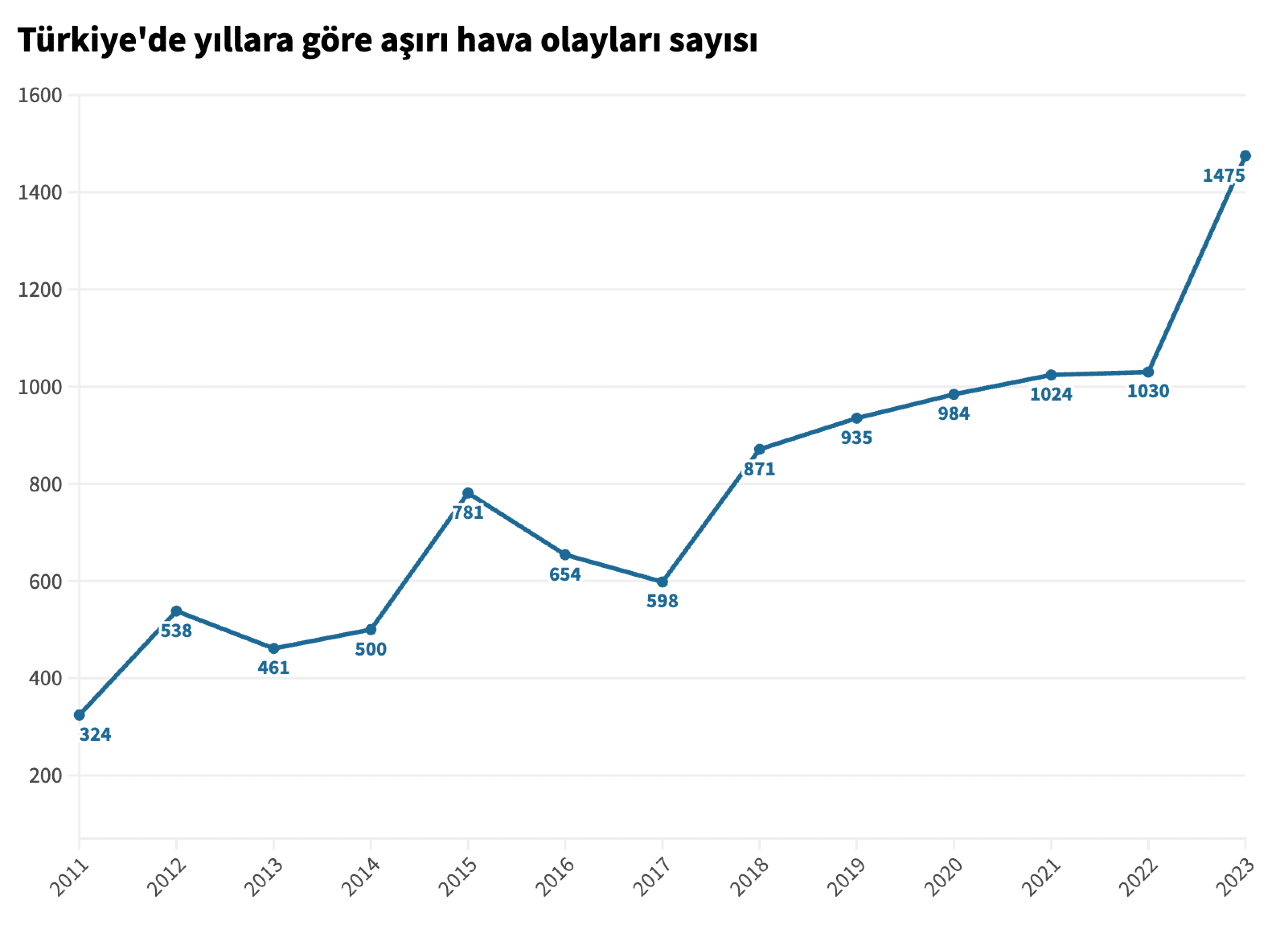 Türkiye’de yaşanan aşırı hava olaylarının sayısı 2023 yılında 1475’e çıkarak yeni bir rekor kırdı. Bir önceki yıl Türkiye’de görülen aşırı hava olaylarının sayısı 1030’du. Türkiye’de aşırı hava olaylarının sayısı son altı yıldır sürekli artıyor.