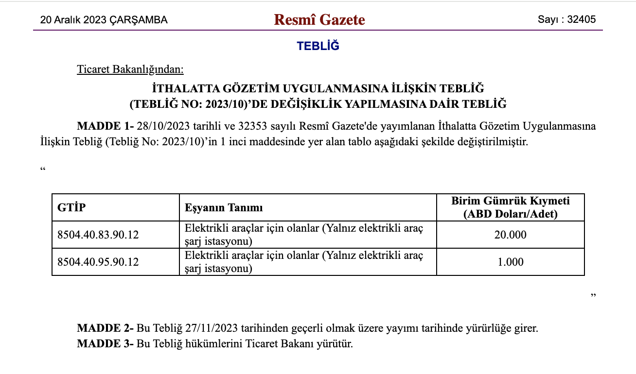 Resmî Gazete’nin 20 Aralık 2023 tarihli sayısında, Ticaret Bakanlığı tarafından Elektrikli Araç Şarj İstasyonlarına yönelik İthalatta Gözetim Uygulamasına İlişkin Tebliğ ile yeni düzenleme yayımlandı.