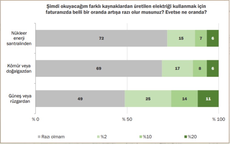 Yenilenebilir enerji kaynaklarından üretilecek enerjiyi kullanmak için elektrik faturasında belli oranda bir artışa razı olacağını söyleyenlerin oranı yüzde 51 iken, yaş azaldıkça ve eğitim seviyesi arttıkça bu duruma razı olacağını söyleyenlerin oranı da artıyor. Ankete göre, faturasında yüzde 2’lik bir artışa razı olanların oranı yüzde 25 iken, toplumun yüzde 14’ü faturasında yüzde 10’luk bir artışa, toplumun yüzde 11’i ise faturasında yüzde 20’lik bir artışa razı.