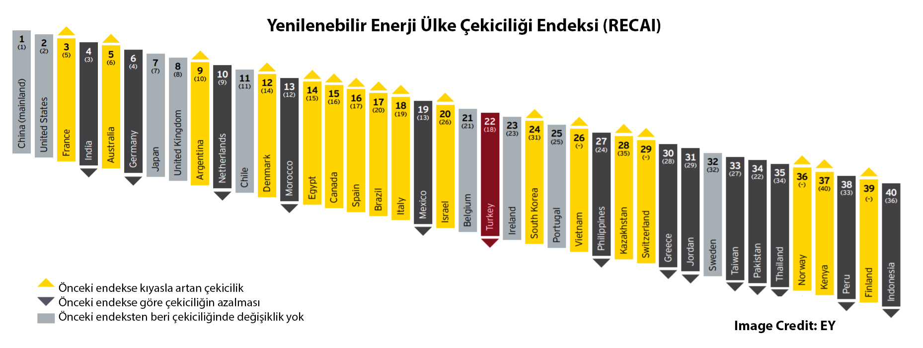 140 ülkede faaliyet gösteren uluslararası denetim ve danışmanlık hizmetleri firması EY eski adıyla Ernst & Young, yılda iki kez yayınladığı “Yenilenebilir Enerji Ülke Çekiciliği Endeksi (RECAI)” sonuçlarını açıkladı. Çin ve ABD dünyanın en çekici yenilenebilir enerji pazarları olmaya devam ederken Hindistan üçüncülüğü Fransa’ya devretti. Türkiye, EY’nin yenilenebilir enerji ülke çekiciliği endeksindeki yerini 4 basamak azaltarak 40 ülke arasında 22. sırada yer aldı.