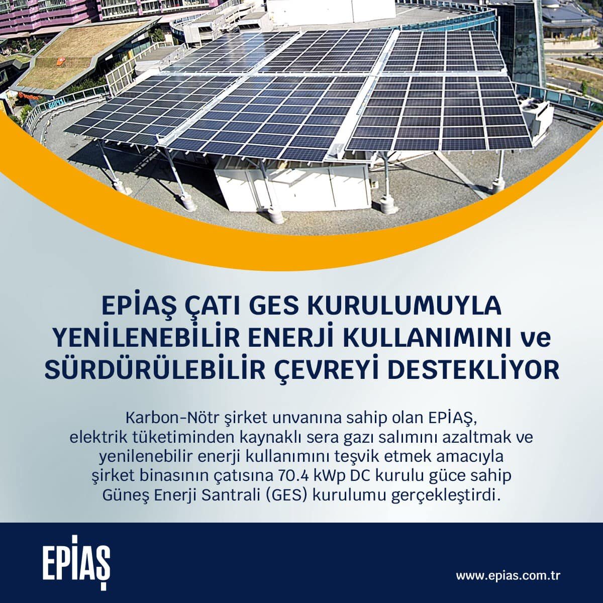 Sınırsız enerji kaynağı olan güneşten faydalanarak yenilenebilir ve temiz enerji kullanımını teşvik etmeyi amaçlayan EPİAŞ, Yönetim Binasının 1.093 m²’lik çatı alanında “EPİAŞ Genel Müdürlük Binası Çatı Üzeri GES Projesini” tamamlayarak hayata geçirdi.