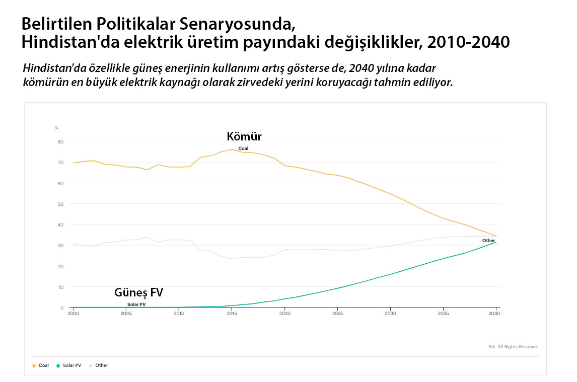 IEA’ya göre, ülkede yenilenebilir enerji kullanımı artmasına rağmen, 2040 yılına kadar, kömürün Hindistan’ın en büyük elektrik kaynağı olarak zirvedeki yerini koruyacağı tahmin ediliyor. Hindistan, 2000 yılından bu yana enerji tüketimini iki katına çıkardı ve ülkedeki enerjinin yüzde 80’i ise hala kömür, petrol ve biyokütle tarafından karşılanıyor. Kömür şu anda Hindistan’ın elektrik üretiminin yüzde 70’ine güç sağlıyor ve güneş enerjisi ise yüzde 4’ten daha azını oluşturuyor.
