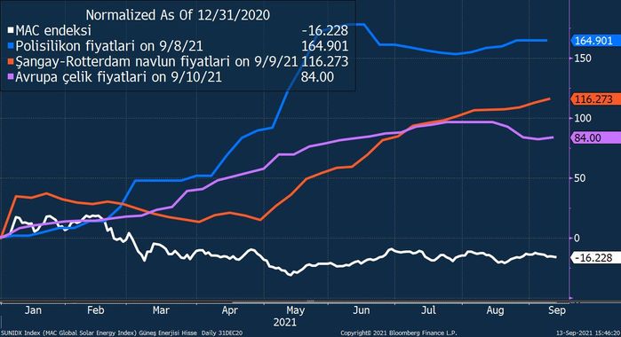 Bloomberg’in güneş enerjisiyle ilgili şirketlerin hisse performansını ölçmek için oluşturduğu MAC Küresel Güneş Enerjisi Endeksi, polisilikon, çelik ve navlun fiyatlarındaki artışla beraber bu sene yüzde 15’e yakın düşüş yaşadı. Analistler ise güneş enerjisi hisseleri için boğa tahminlerini korumaya devam ediyor.
