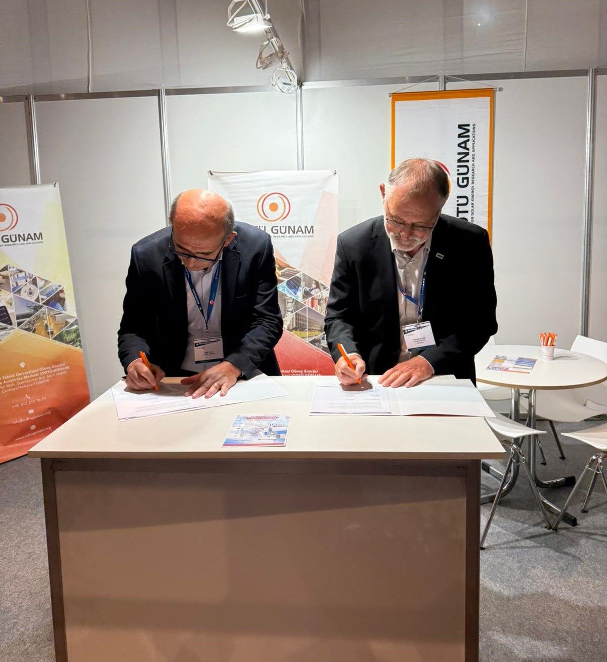 © Fraunhofer ISE Prof. Raşit Turan (solda) ve Prof. Andreas Bett, EU PVSEC 2025’te Mutabakat Zaptı’nı imzalarken.