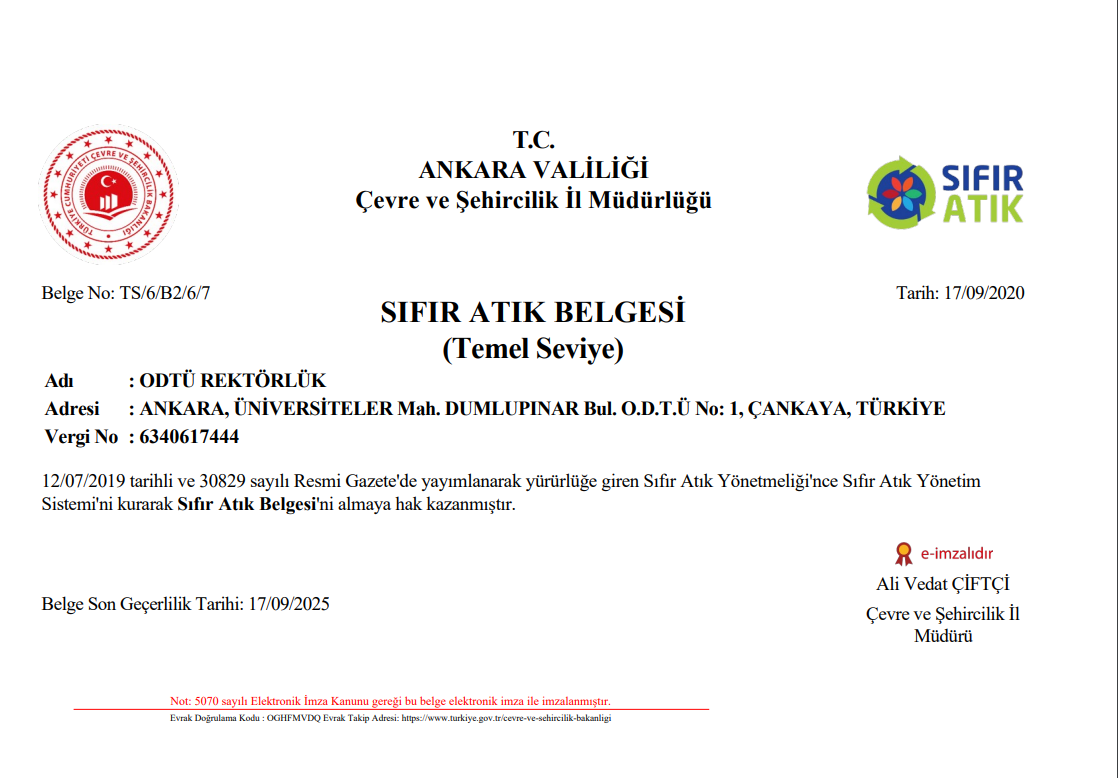 Orta Doğu Teknik Üniversitesi (ODTÜ), atık oluşumunun önlenmesi ve atıkların azaltılması, depolanması, taşınması ve işlenmesi süreçlerini içine alan Sıfır Atık Yönetim Sistemi’ni (SAYS) kurarak Sıfır Atık Belgesi almaya hak kazandı.