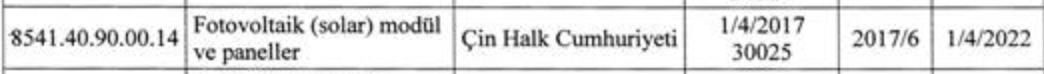 1 Nisan 2017 tarihli Resmî Gazete’de yayımlanan tebliğ ile Çin Halk Cumhuriyeti menşeli fotovoltaik paneller için anti-damping uygulamaları başlatılmıştı.