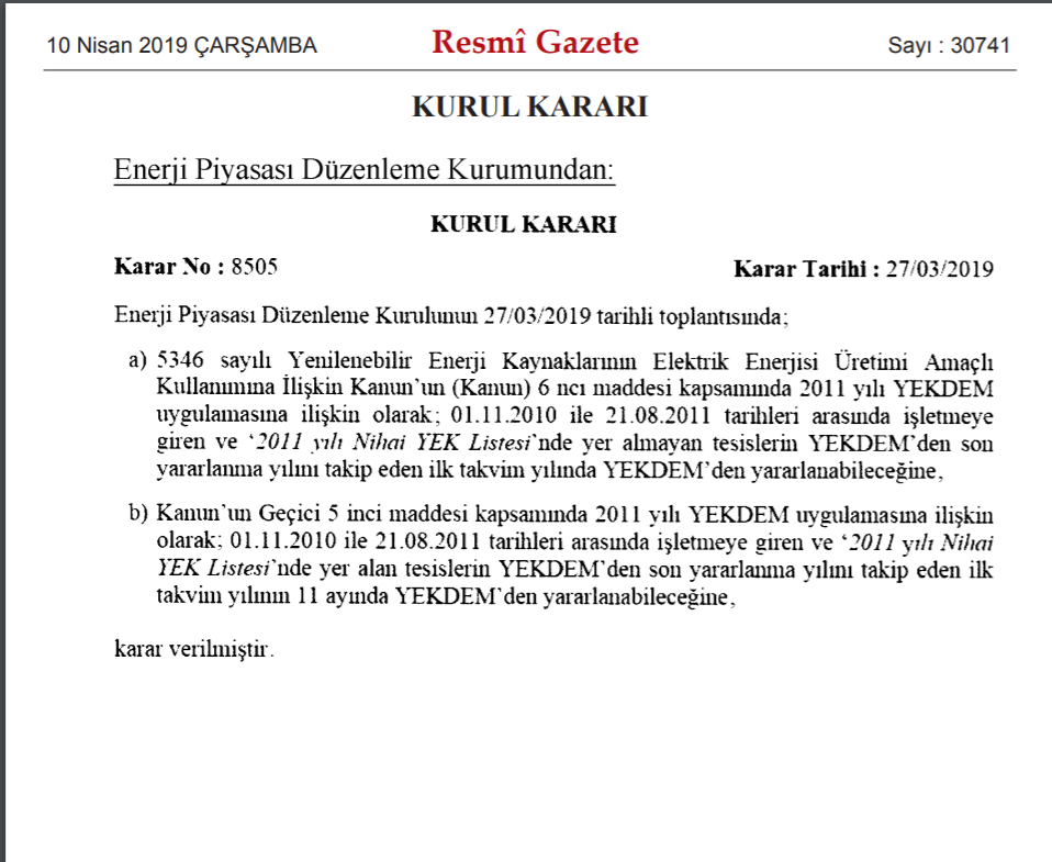 10 Nisan 2019 tarihli Resmi Gazete’de yayımlanan Enerji Piyasası Düzenleme Kurumu (EPDK) kararı ile YEKDEM’den yararlanma süreleri uzatıldı.