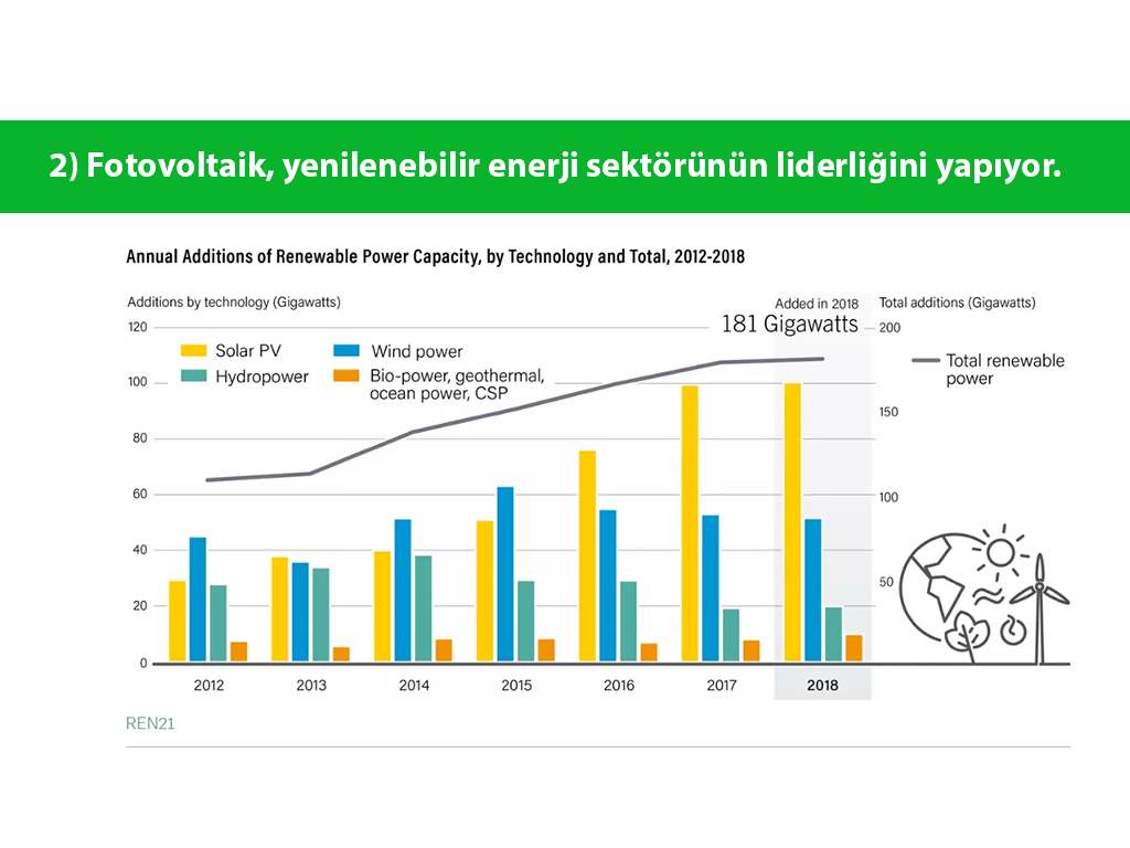 2) Fotovoltaik, yenilenebilir enerji sektörünün liderliğini yapıyor.