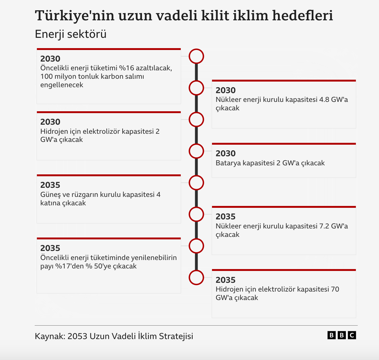 Bakanın COP29’da sunduğu 2053 Türkiye’nin Uzun Dönemli İklim Değişikliği Stratejisi (Long-term Low Emission Development Strategy – LTS), 2053 net sıfır emisyon hedefine ulaşabilmek için sektörel stratejik hedefleri, farklı sektörlere yönelik temel politikaları belirliyor ve yol haritasını oluşturuyor.