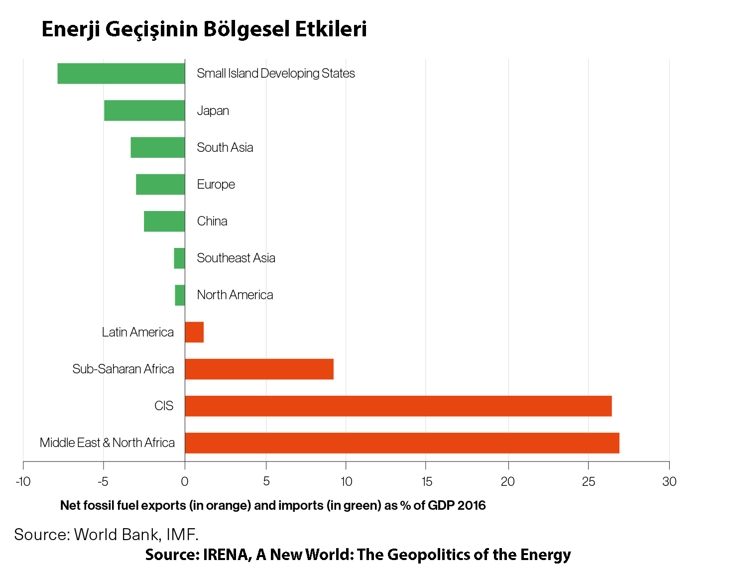 IRENA’ya göre, jeopolitik ve güç dinamiklerinde değişimler içeren bu süreç, uzun dönemde çoğu ülkenin enerji bağımsızlığını ve güvenliğini güçlendirecek. Öte yandan, fosil yakıtlara bağımlı olan devletler sürece uyum sağlayamadıkları takdirde, ihracatları azalırken Çin gibi yenilenebilir enerji kaynaklarına yoğun yatırım yapan devletlerin ise küresel güçleri artacak. Değişiklikler karşısında strateji geliştiremeyen ülke ve sektörler, zorlu bir uyum süreci ile karşı karşıya kalırken, küresel enerji geçişinin iklim değişikliği, refah ve sürdürülebilir kalkınmayı ise her koşulda teşvik edeceği vurgulanıyor.