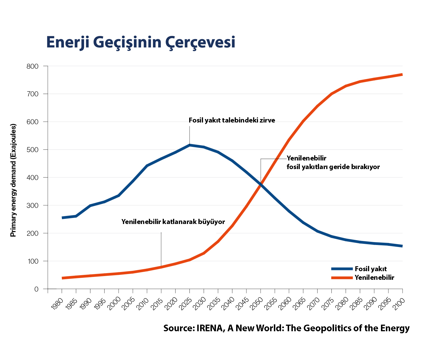 IRENA, yenilenebilir enerjinin küresel çapta genişlemesinin jeopolitik etkilerini incelediği raporda; kömür, petrol ve gazın azalan önemi ile birlikte jeopolitik güç yapılarında büyük değişiklikler olacağını öngörüyor. Statnett, Engie, Enel gibi enerji şirketlerinin yanı sıra DNV GL ve Rocky Mountain araştırma enstitülerinin katkı sunduğu çalışma, Norveç, Almanya ve Birleşik Arap Emirlikleri hükümetleri tarafından finanse edildi. Rapora göre, çağa uyum sağlayamayan uluslar ve endüstrilerde geçişin iyi yönetilmemesi, uluslararası tehlikelere yol açabilir. Geçişin gerçekleşeceği hız ve sahip olacağı etkiler çeşitlik gösterse de tüm tarafların için diyalog çağrısı yapılıyor.
